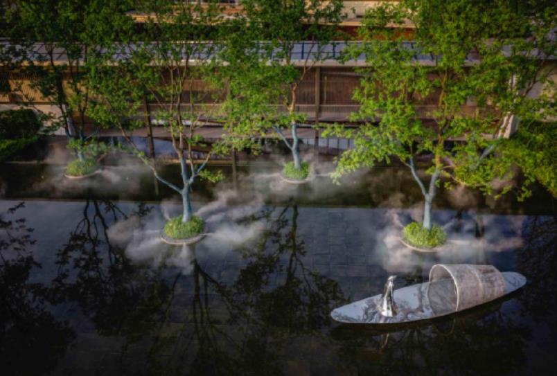 ??????? 姿態(tài)搖曳的烏桕,平靜如鏡的水面偶爾吹來一陣細(xì)軟的清風(fēng),每個(gè)人總需要這樣的幻彩凝香,回歸自然,為美好駐足留望;水面與陽光為伴,映射出五彩紛呈的理想世界……時(shí)而蕩漾的水面上流轉(zhuǎn)著華麗的色彩,設(shè)計(jì)師將它叫做“幻彩”;金屬質(zhì)感的流動(dòng)線條,縈繞在水面以及水底,水面的線條構(gòu)建出幾座精致的綠色小島,它們被綠植簇?fù)恚瑢哟畏置鳎c(diǎn)綴著一棵棵形態(tài)優(yōu)美的叢生烏桕。水底的線條隨著“綠島”圍繞又延續(xù),讓水景不僅在色彩上幻彩多姿,在結(jié)構(gòu)與畫面感上也充滿著光怪陸離的視覺沖擊。