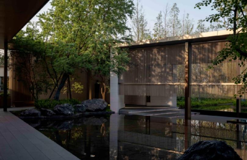 之后我們見到的又是另一種形態(tài)的水,板巖平鋪?zhàn)龅祝鏊畡t側(cè)鋪三角幾何微地形并種植單桿烏桕林,這便是山水林的縮影,頗有江南美景細(xì)水流長(zhǎng)的意味,將歸家者從快節(jié)奏的都市生活中一下子拉進(jìn)江南水鄉(xiāng)的愜意中,營(yíng)造出一種禪境,置身其中的人感悟有所相同又有所不同,歸于安寧。